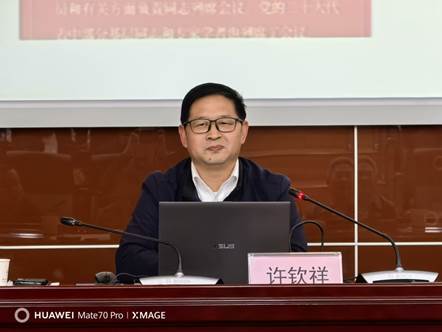 (经济管理学院 通讯员 张雅蕊)为深入贯彻落实党的二十大关于“强化标准引领”的战略部署,提升师生对标准化在经济管理中战略作用的认识,2025年11月11日,湖北文理学院经济管理学院在图书馆一楼多功能报告厅举办“巩固标准化基础,促进高质量发展”学术讲座。本次讲座特邀湖北省市场监督管理局二级巡视员许钦祥担任主讲嘉宾,学校纪委书记·监察专员张宇辉书记主持活动。襄阳市市场监督管理局副局长邢红丽、标准科科长方胜、经管学院领导班子、科研学术骨干及学生代表共同参会。